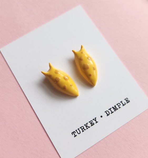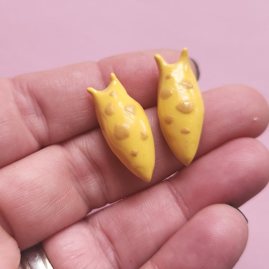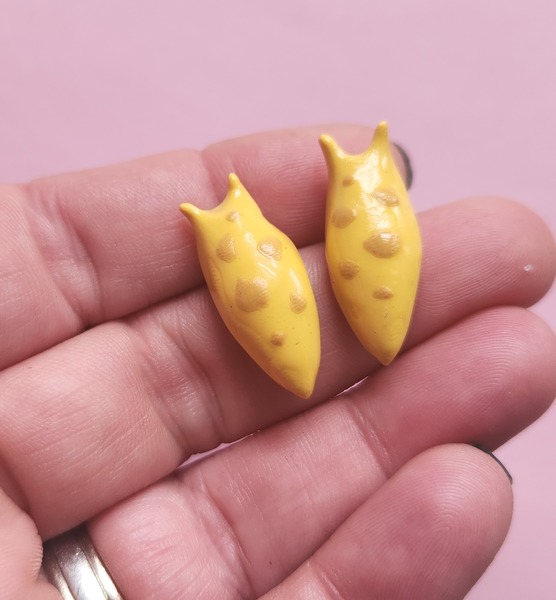 Banana slug shaped stud earrings, inspired by the banana slugs from Coraline.