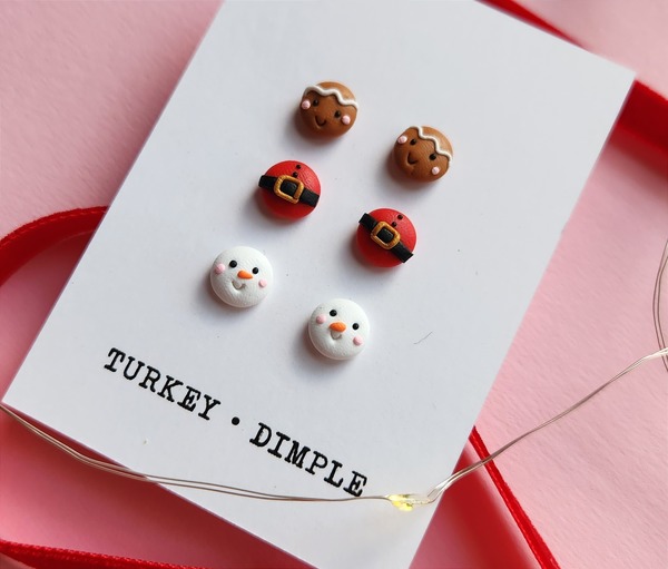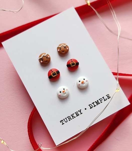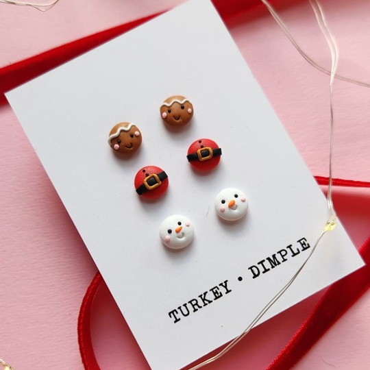 Set of three different pairs of Christmas themed stud earrings. Includes one pair of gingerbread faces, one pair of snowman faces and one Santa themed pair.